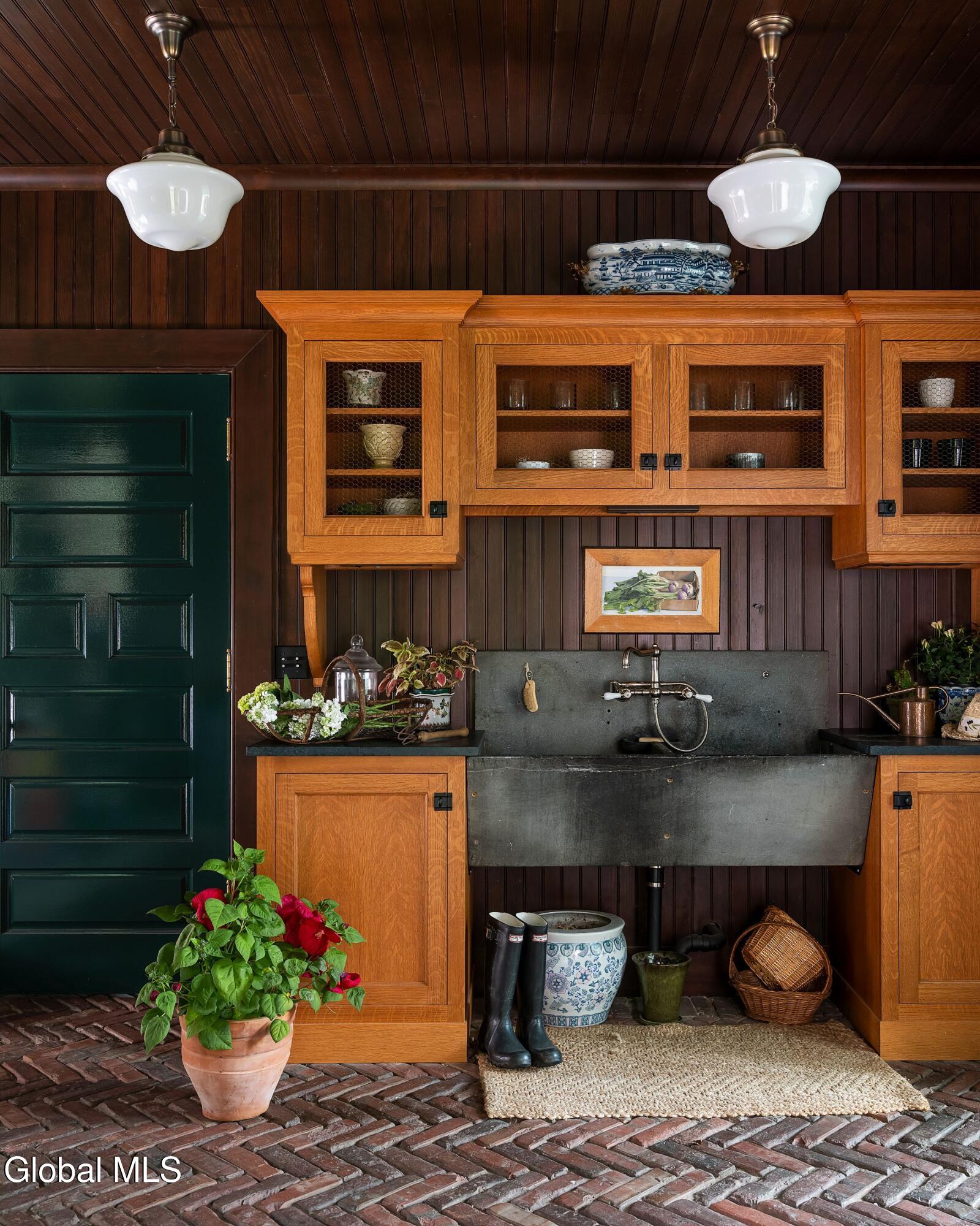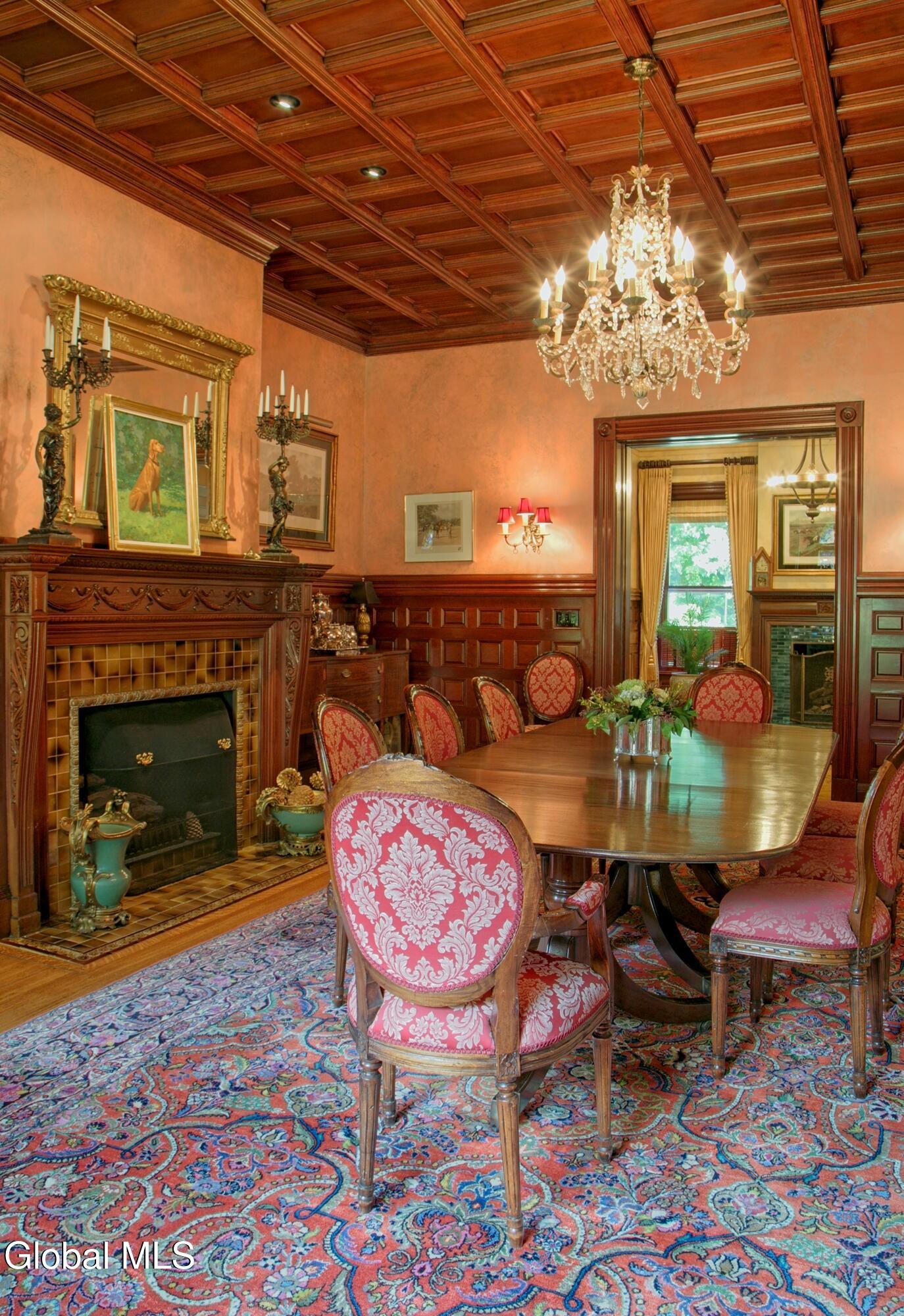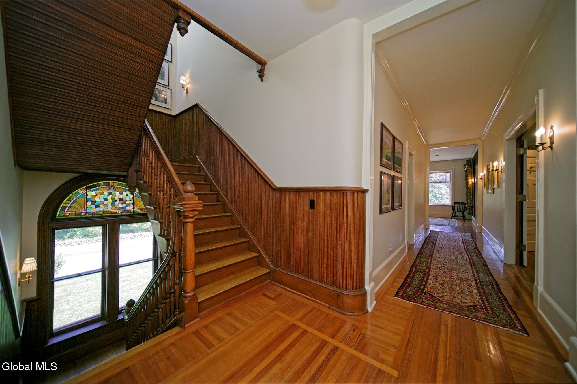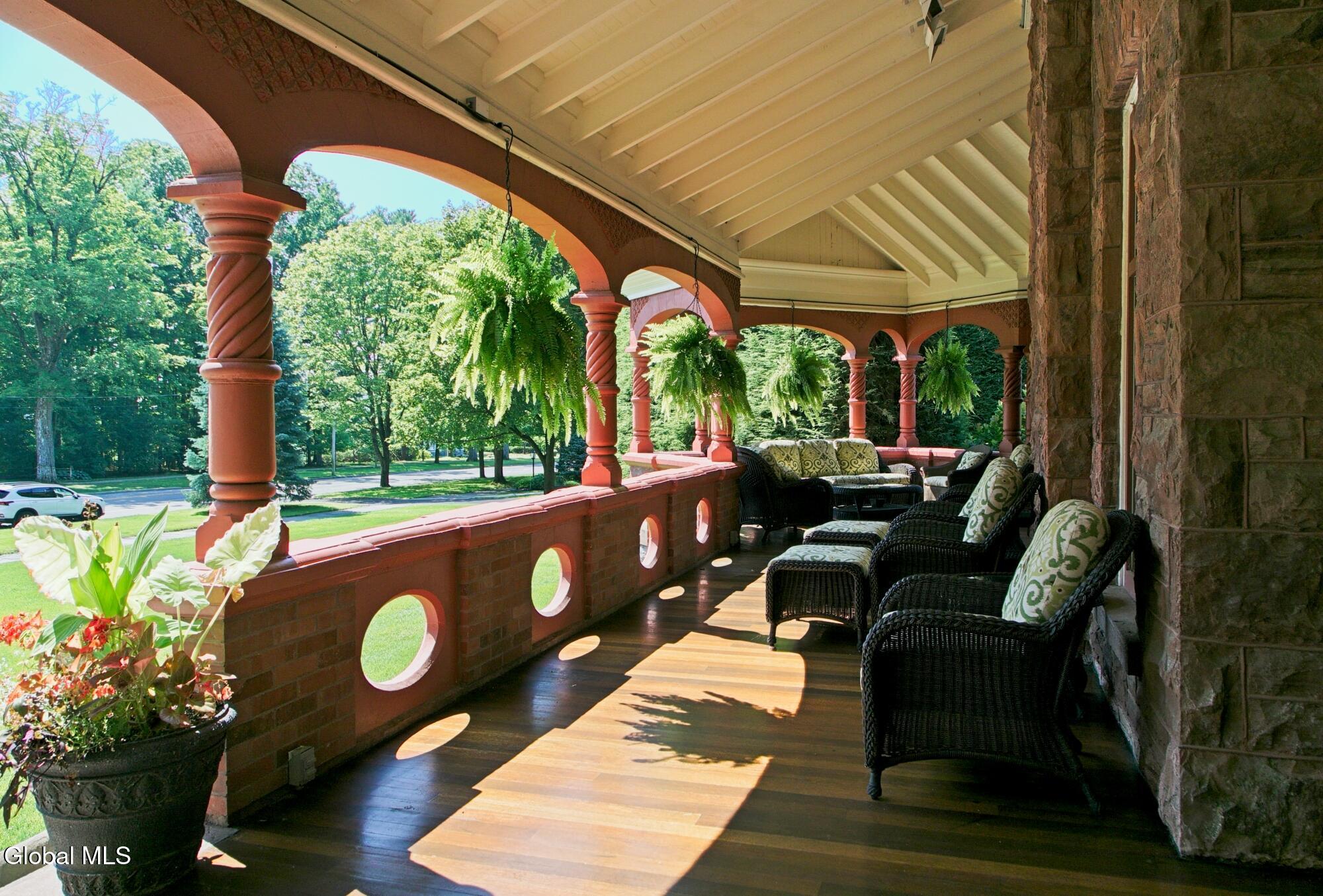 Welcome to Redstone, an exquisite, fully restored and updated historic home located on prestigious North Broadway in the heart of Saratoga Springs. This beautiful Queen Anne Romanesque Revival-style home blends the intricate details and skillful craftsmanship of a bygone era with the comforts and conveniences of today's lifestyle. The brick and sandstone facade, soaring eleven-foot ceilings, masterfully carved woodwork, stained glass windows, mantled fireplaces, and sweeping staircases are among the original features reflecting the home's splendor and artistry. Enjoy hosting both small, intimate gatherings and exciting soirees, aided by the home's thoughtful and modern amenities. The main house features seven en suite bedrooms including a generous primary suite. The live-in kitchen anchors the home with a fireplace, soapstone countertops, mahogany wet bar, and views into the surrounding grounds. A lower-level catering kitchen, wine cellar, elevator, and finished basement further enhance the home's functionality. In 2015, a significant architectural addition was completed, earning the New Contextual Design Award from the Saratoga Springs Preservation Foundation. This Carriage House-style expansion, connected by a skylit mudroom breezeway, includes a vaulted great room, exposed barn beams, reclaimed wood flooring, full bath, custom bar, and a cupola that fills the space with natural light. A sunroom overlooking formal gardens, garden sink area, and two-car garage complete the space. This property offers a wraparound front porch, private side yard, and formal gardens ideal for outdoor entertaining. The location provides easy access to downtown Saratoga Springs and Skidmore College, while preserving a sense of privacy and retreat.