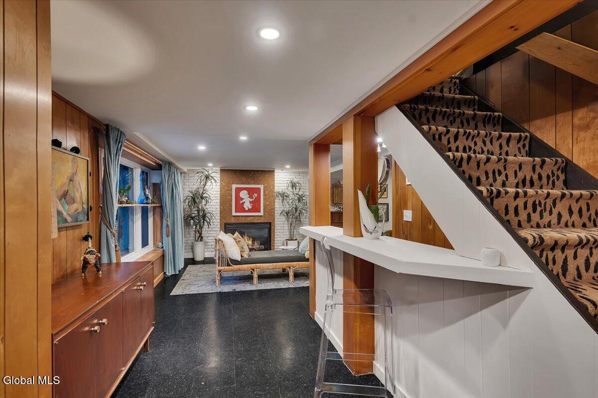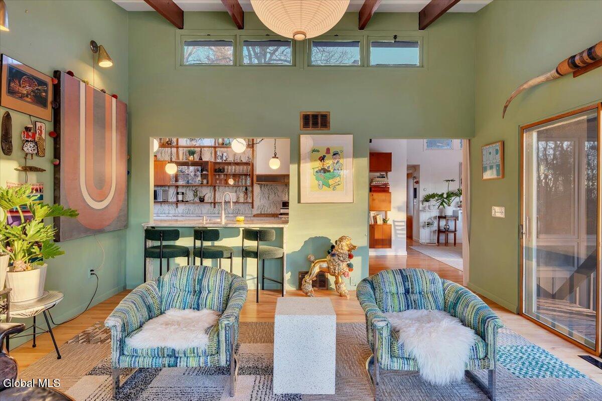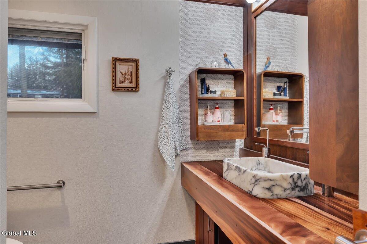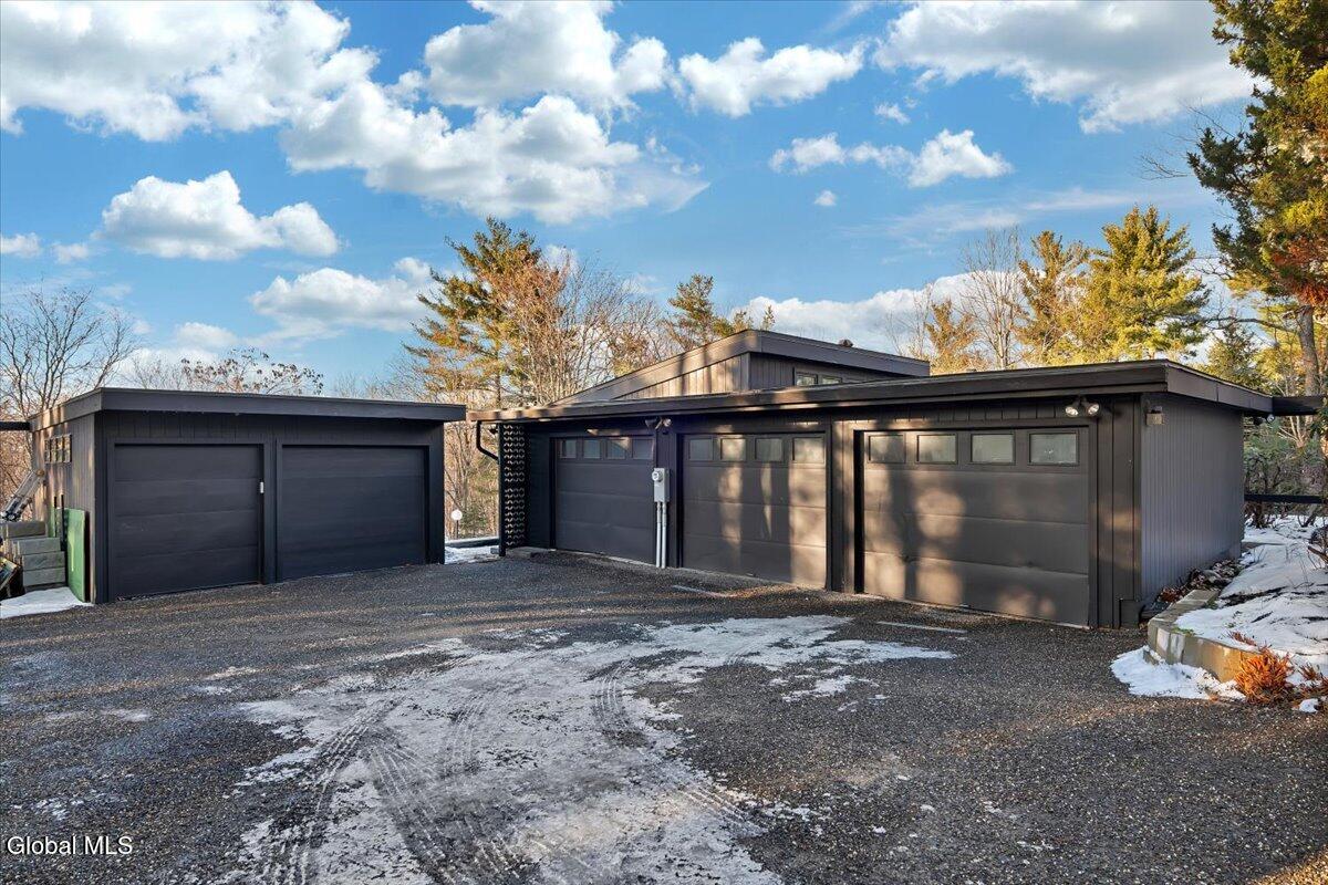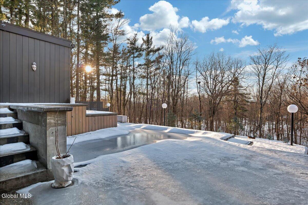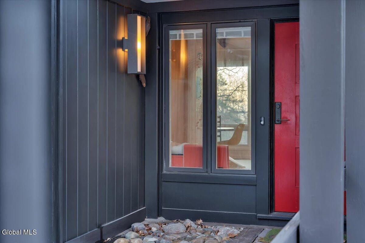 Multiple Offers - Due Jan 29th at 6pm Experience the pinnacle of mid-century modern preservation and contemporary innovation at The Vanguard Villa (80 Van Leuvan Drive S) in North Greenbush. Located in the desirable East Greenbush Schools and Genet Elementary. Originally constructed in 1958, this architecturally authentic masterpiece has been meticulously reimagined to honor its heritage while embracing elevated luxury. Every line reflects a deep respect for the period's architectural language—warm, intentional, and effortlessly sophisticated. The exterior, clad in natural wood siding and crowned with a new architect-designed roof, sets a refined, organic tone. Inside, the main level unfolds beneath dramatic vaulted ceilings, creating an immediate sense of volume. New maple hardwood floors and slate accents enhance the clean geometry and warmth. The reimagined kitchen is a sculptural triumph, boasting granite countertops, a breakfast bar, and a premium five-burner gas range with double ovens. The home offers dual primary suites for ultimate flexibility. The upper-level retreat features a private balcony and a spa-inspired river rock steam shower. The expansive lower-level suite is a destination unto itself, featuring a refined wet bar, a custom walk-in closet, and an iconic mid-century bathroom with a collectible Crane Neuvogue sink. The grounds function as a private modern resort, complete with a redwood wraparound deck, water feature, and new landscaping. The experience is anchored by a saltwater plunge pool that doubles as a hot tub with a high-output heater and European Renolit liner, surrounded by two new river stone patios. Modern infrastructure includes a whole-house Generac generator, Pella windows, new skylights, new AC, a three-car garage, and a central vacuum system. This is a rare offering where curated design meets timeless innovation.