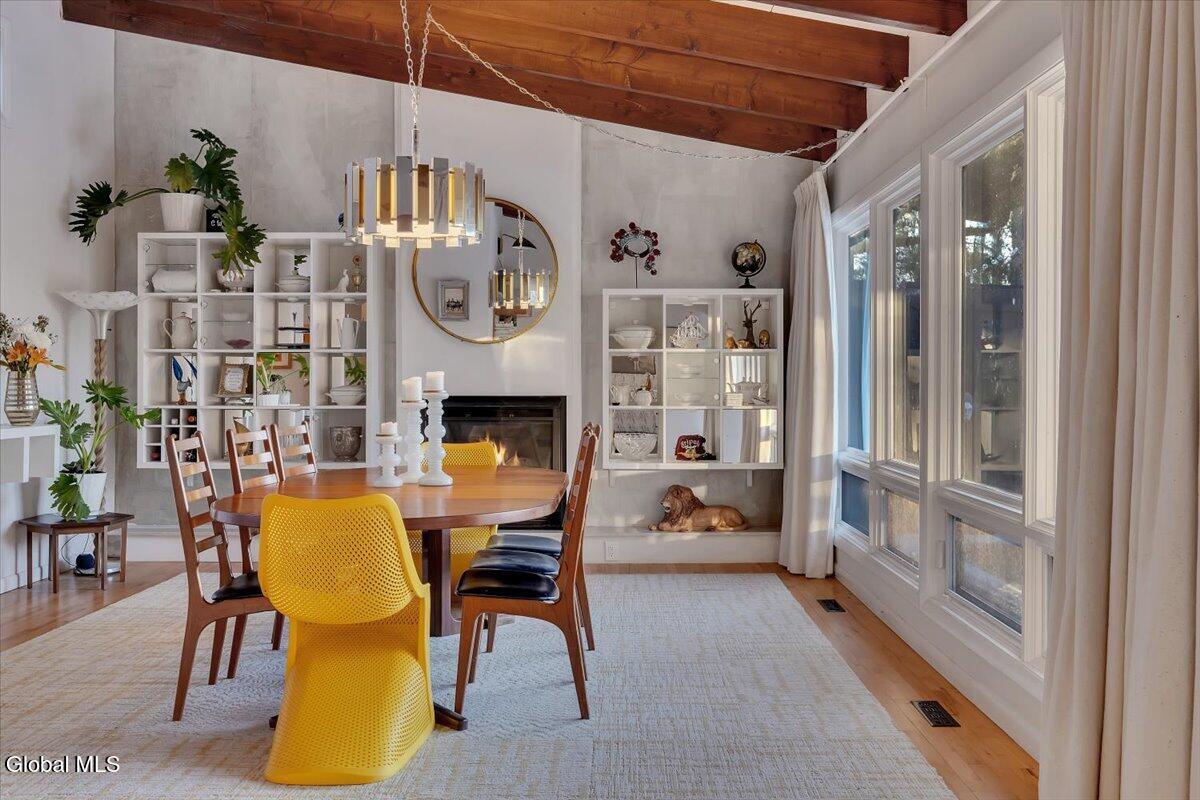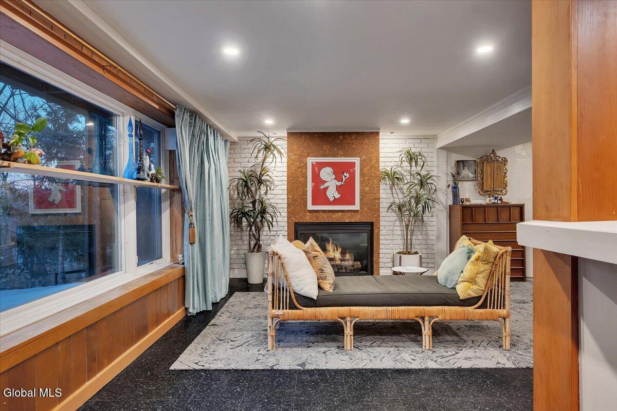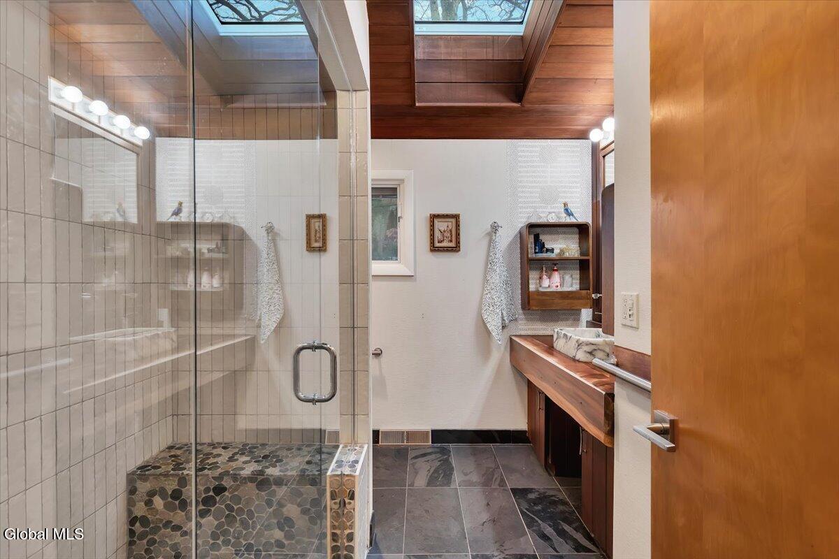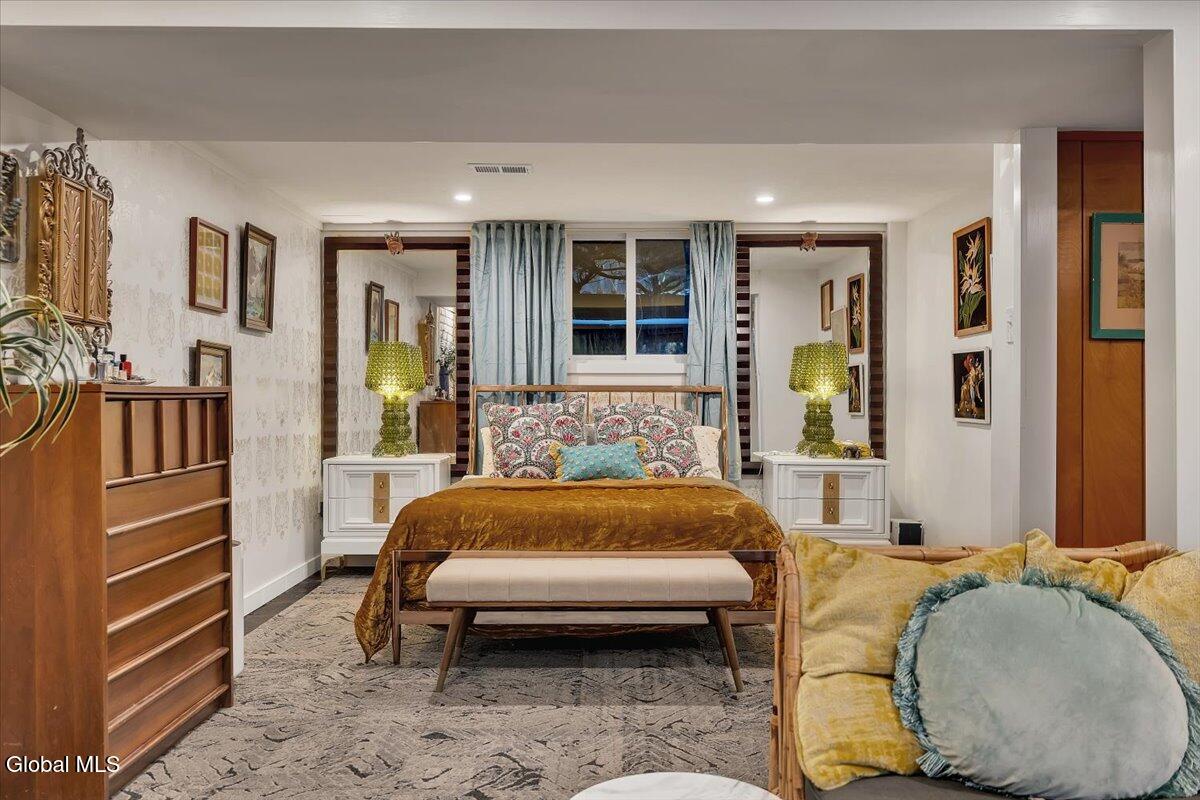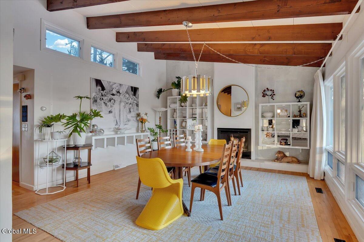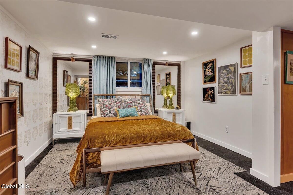 Multiple Offers - Due Jan 29th at 6pm Experience the pinnacle of mid-century modern preservation and contemporary innovation at The Vanguard Villa (80 Van Leuvan Drive S) in North Greenbush. Located in the desirable East Greenbush Schools and Genet Elementary. Originally constructed in 1958, this architecturally authentic masterpiece has been meticulously reimagined to honor its heritage while embracing elevated luxury. Every line reflects a deep respect for the period's architectural language—warm, intentional, and effortlessly sophisticated. The exterior, clad in natural wood siding and crowned with a new architect-designed roof, sets a refined, organic tone. Inside, the main level unfolds beneath dramatic vaulted ceilings, creating an immediate sense of volume. New maple hardwood floors and slate accents enhance the clean geometry and warmth. The reimagined kitchen is a sculptural triumph, boasting granite countertops, a breakfast bar, and a premium five-burner gas range with double ovens. The home offers dual primary suites for ultimate flexibility. The upper-level retreat features a private balcony and a spa-inspired river rock steam shower. The expansive lower-level suite is a destination unto itself, featuring a refined wet bar, a custom walk-in closet, and an iconic mid-century bathroom with a collectible Crane Neuvogue sink. The grounds function as a private modern resort, complete with a redwood wraparound deck, water feature, and new landscaping. The experience is anchored by a saltwater plunge pool that doubles as a hot tub with a high-output heater and European Renolit liner, surrounded by two new river stone patios. Modern infrastructure includes a whole-house Generac generator, Pella windows, new skylights, new AC, a three-car garage, and a central vacuum system. This is a rare offering where curated design meets timeless innovation.