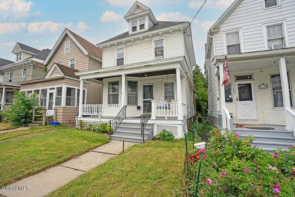 Beautiful Colonial in the desirable Pine Hills neighborhood. This charming home features gleaming hardwood floors, stunning natural woodwork, and built-in storage that adds character and warmth throughout. The bright and cozy 3-season porch is perfect for relaxing, while the spacious front porch with swing provides a welcoming spot to enjoy your mornings. Inside, you'll find an updated full bathroom with a Bath Fitter upgrade, plus a convenient half bath in the basement. The kitchen has been refreshed with a new refrigerator, dishwasher, and sink, making it move-in ready. The full walk-up attic with a cedar closet offers excellent storage and potential for expansion. Outside, enjoy a fenced yard with plenty of space for gardening or play, and easy on-street parking. This home blends classic character with modern updates, a true Pine Hills gem! Just moments from Washington Park, Washington Avenue Branch Library, Albany Med and many great Albany restaurants. Welcome home!
