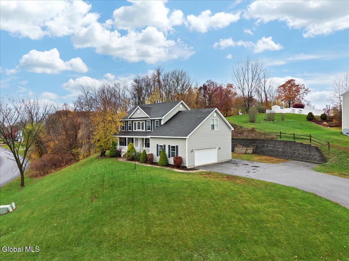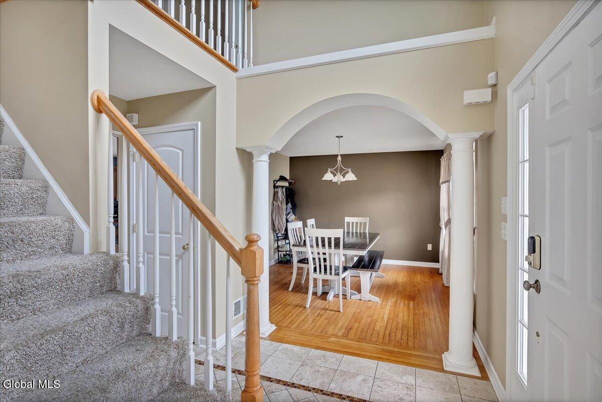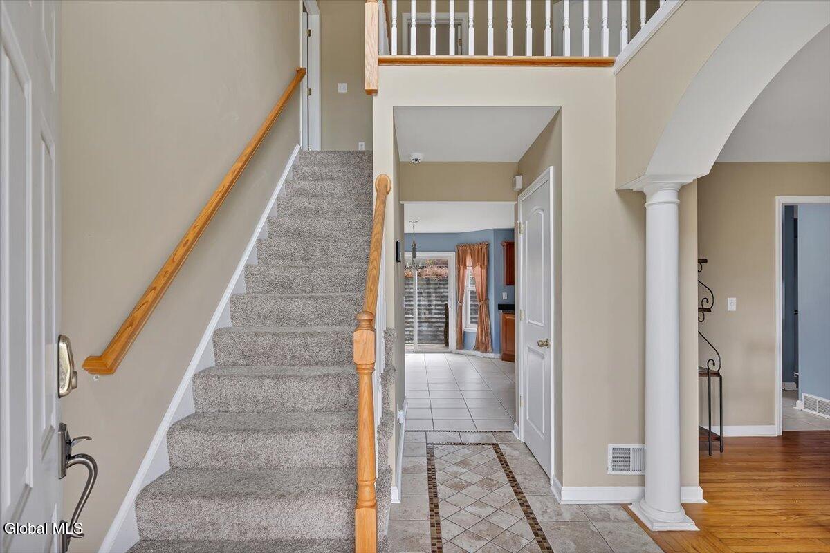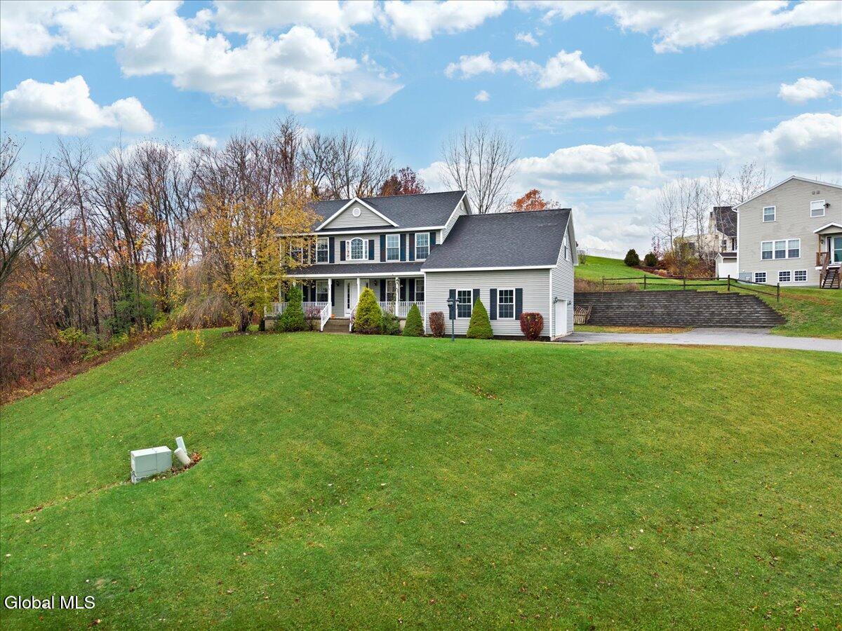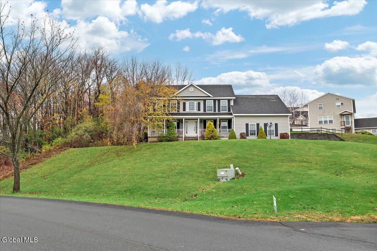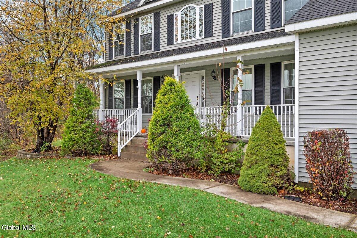 Welcome to 9 Mallards Landing N, a stately 4-bedroom, 2.5-bath Colonial offering over 2,400 square feet of elegant living space in one of Waterford's most desirable neighborhoods. Set in the Shenendehowa School District and just minutes from Clifton Park and Troy, this home delivers both refined style and everyday functionality. Curb appeal abounds with a classic symmetrical façade, a full front porch, and mature landscaping that frames the home beautifully. Step inside to a two-story foyer with tile inlay and graceful architectural details, including arched openings and decorative columns. Hardwood flooring flows into the formal dining and living rooms, both filled with natural light and designed for entertaining or relaxed daily living. The heart of the home is the spacious eat-in kitchen, featuring stainless steel appliances, a center island, and direct access to the rear deck through sliding glass doors. The adjacent family room offers a comfortable, open atmosphere with hardwood floors and plenty of room to unwind. Upstairs, the private primary suite includes a walk-in closet and a full en suite bath with dual vanities, and a tiled shower. Three additional bedrooms offer flexibility for family, guests, or remote work setups, all serviced by a second full bath. Additional highlights include central air, a two-car attached garage, public water and sewer, and a full basement for storage or future expansion. The intimate backyard provides privacy and potential for outdoor entertaining or play. This is a move-in-ready opportunity in a community known for its schools, convenience, and strong resale value. Schedule your private showing today.