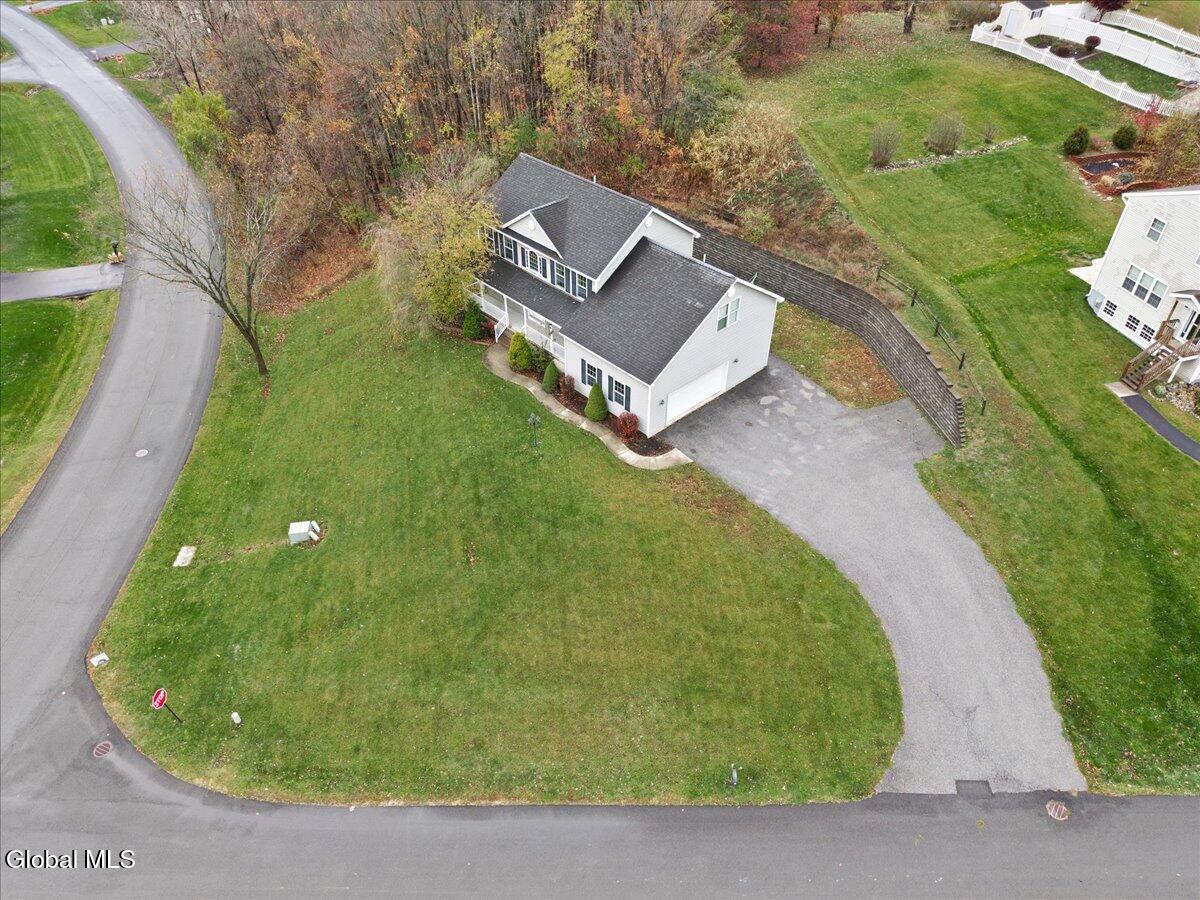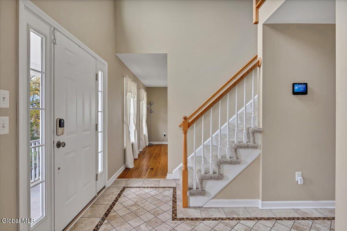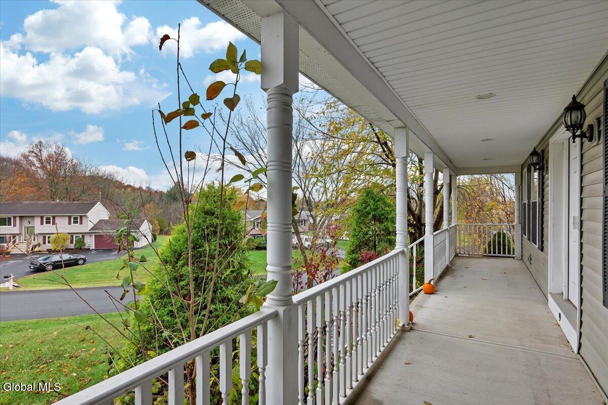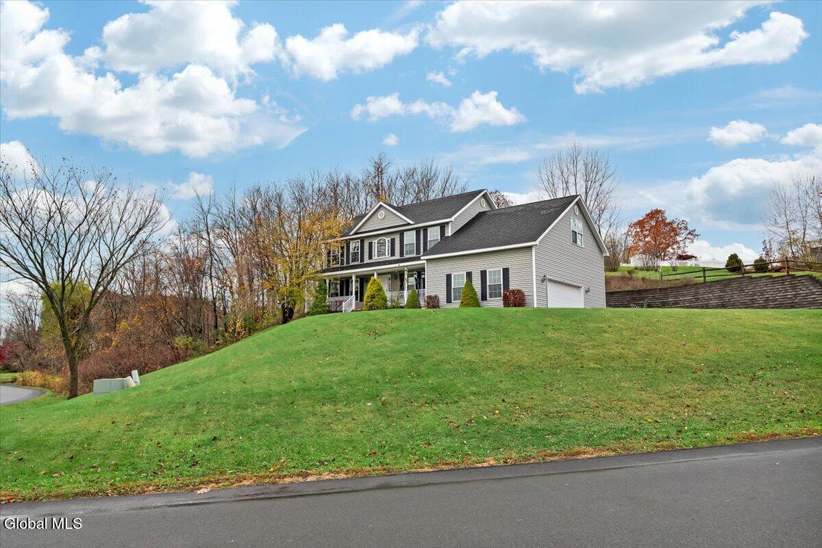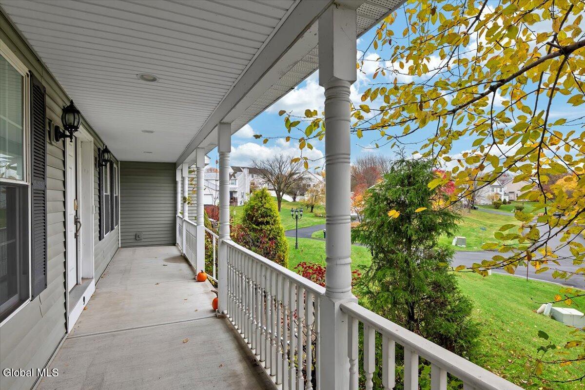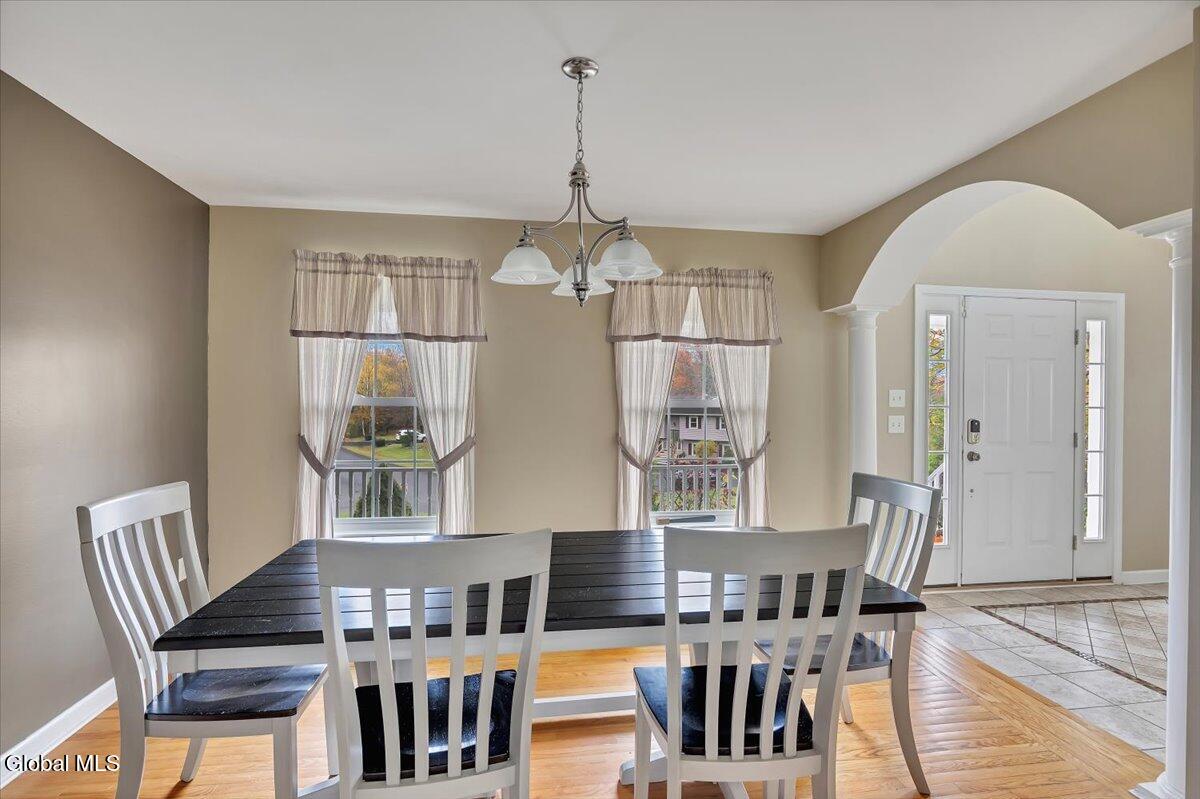 Welcome to 9 Mallards Landing N, a stately 4-bedroom, 2.5-bath Colonial offering over 2,400 square feet of elegant living space in one of Waterford's most desirable neighborhoods. Set in the Shenendehowa School District and just minutes from Clifton Park and Troy, this home delivers both refined style and everyday functionality. Curb appeal abounds with a classic symmetrical façade, a full front porch, and mature landscaping that frames the home beautifully. Step inside to a two-story foyer with tile inlay and graceful architectural details, including arched openings and decorative columns. Hardwood flooring flows into the formal dining and living rooms, both filled with natural light and designed for entertaining or relaxed daily living. The heart of the home is the spacious eat-in kitchen, featuring stainless steel appliances, a center island, and direct access to the rear deck through sliding glass doors. The adjacent family room offers a comfortable, open atmosphere with hardwood floors and plenty of room to unwind. Upstairs, the private primary suite includes a walk-in closet and a full en suite bath with dual vanities, and a tiled shower. Three additional bedrooms offer flexibility for family, guests, or remote work setups, all serviced by a second full bath. Additional highlights include central air, a two-car attached garage, public water and sewer, and a full basement for storage or future expansion. The intimate backyard provides privacy and potential for outdoor entertaining or play. This is a move-in-ready opportunity in a community known for its schools, convenience, and strong resale value. Schedule your private showing today.