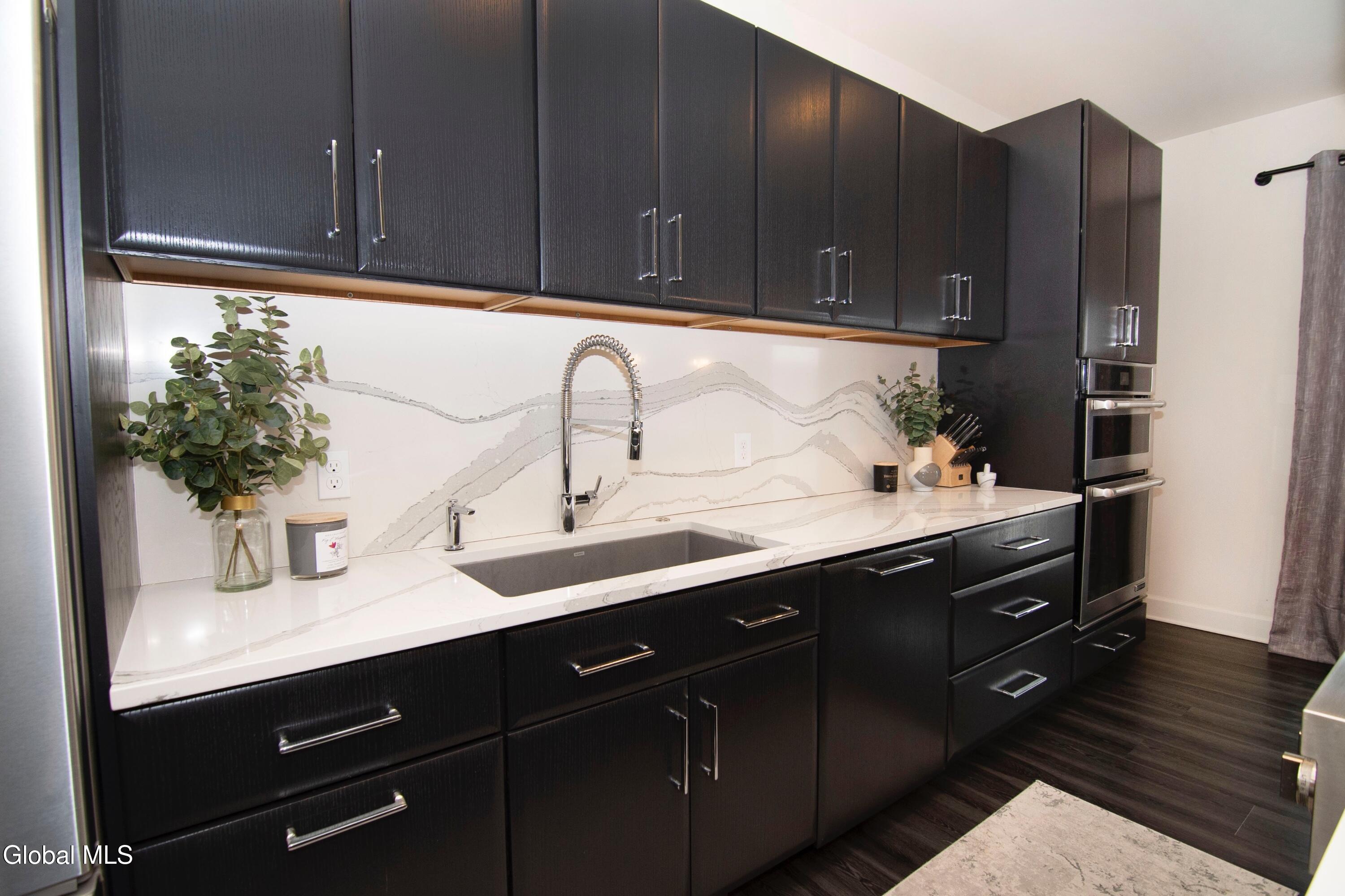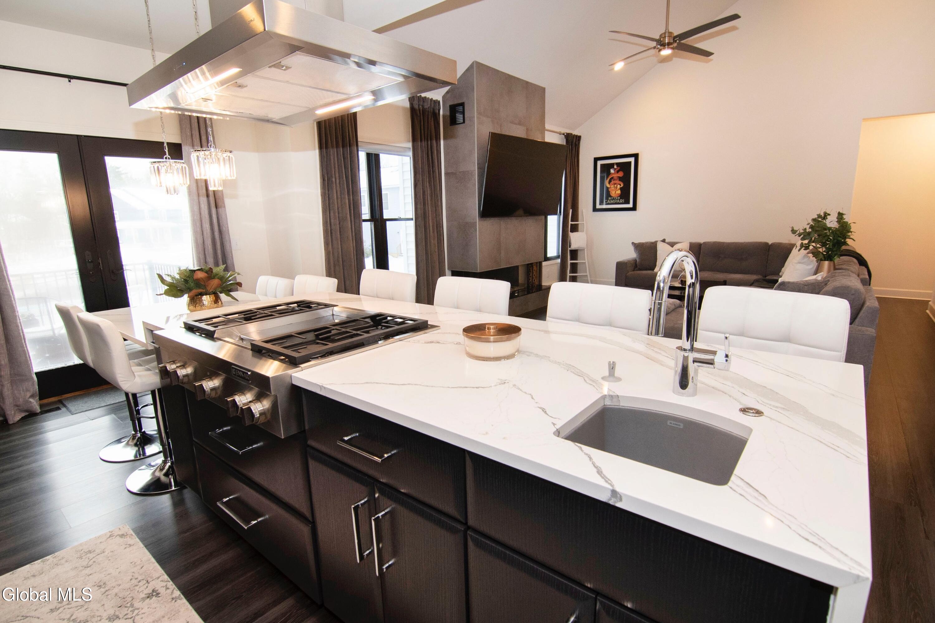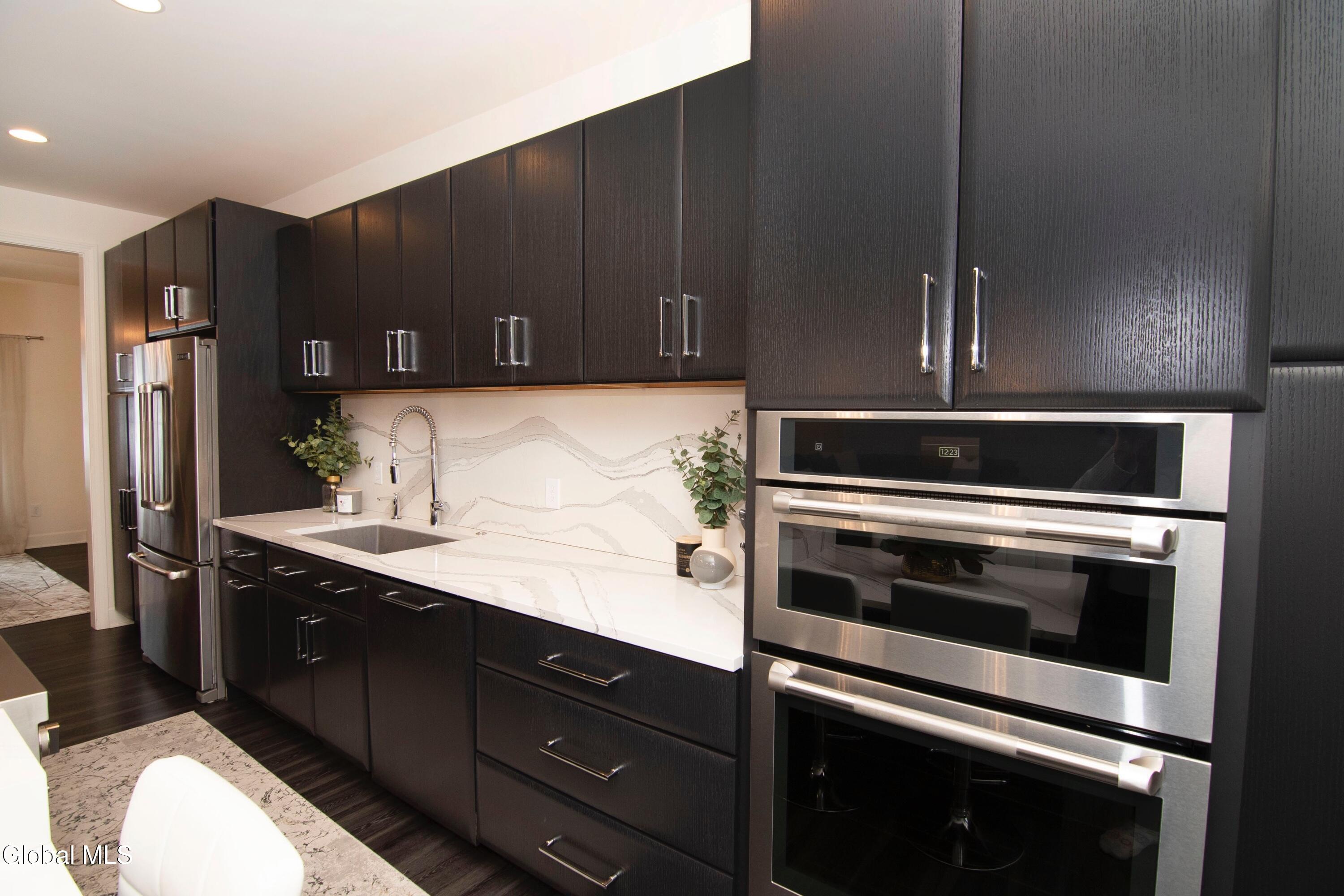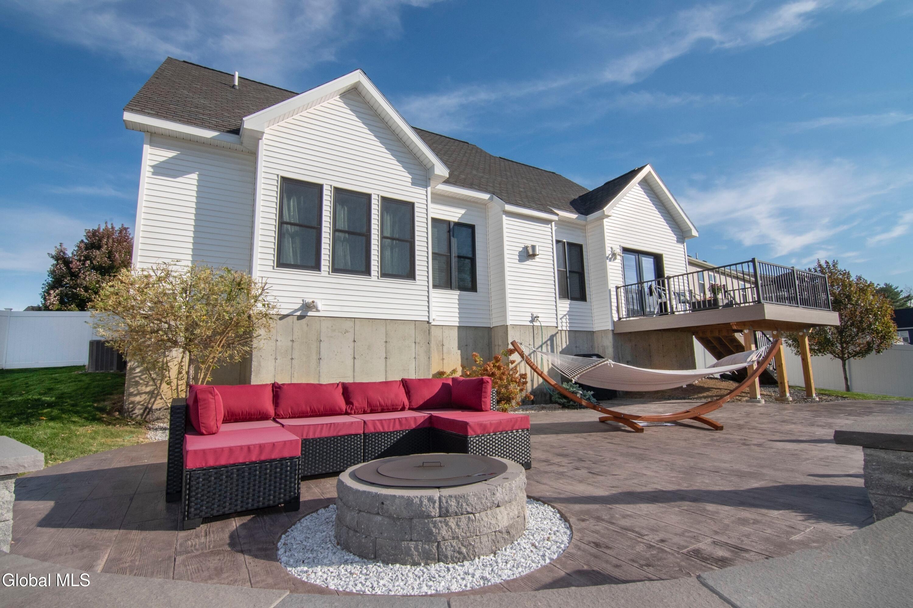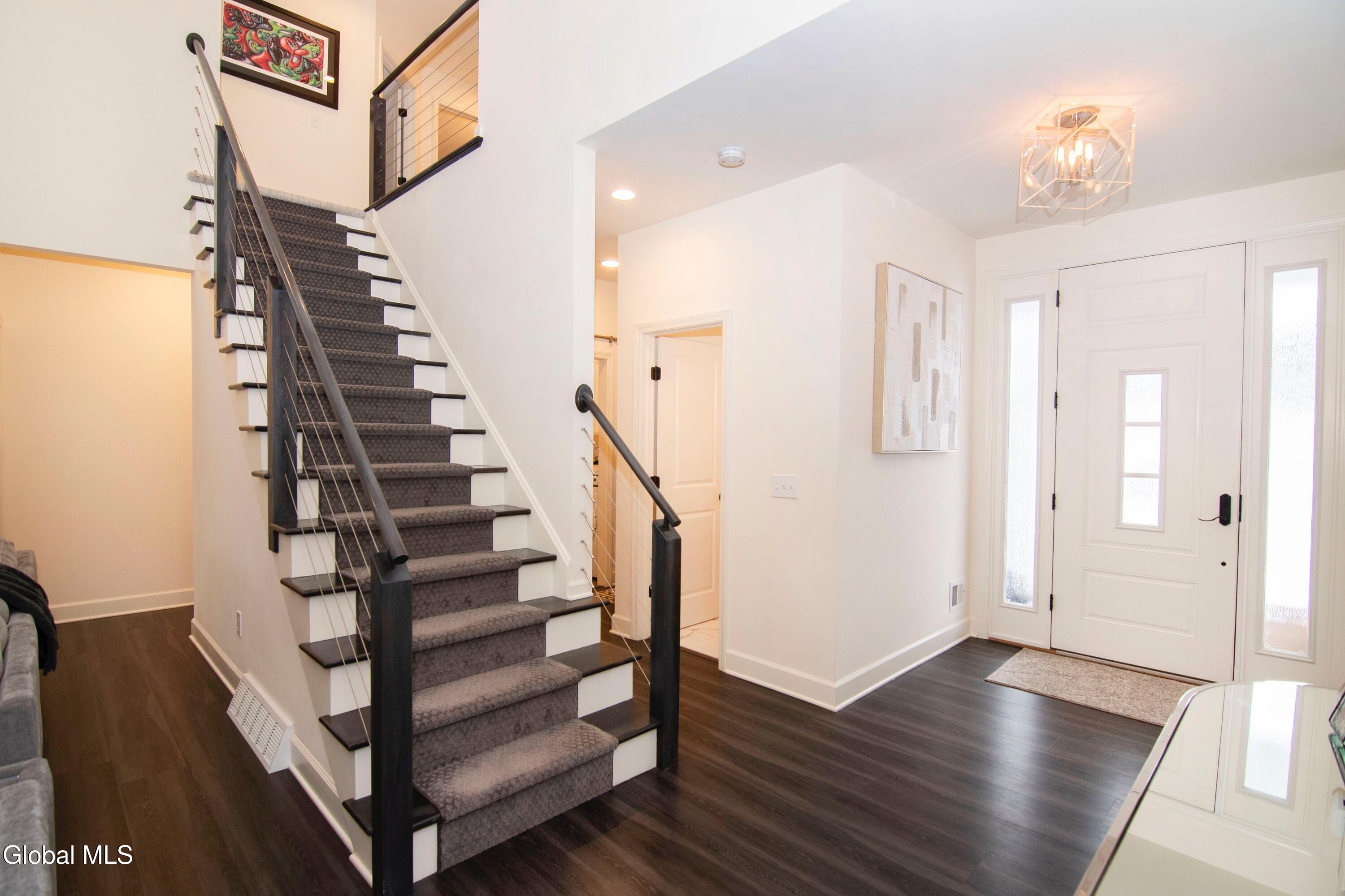 Experience refined modern living in this exceptional custom-built home, designed with striking architectural detail and premium upgrades throughout. A dramatic two story vaulted ceiling sets the tone upon entry, leading into an expansive open floor plan with a formal dining room and anchored by a stunning gourmet kitchen. Outfitted with state-of-the-art JENN-AIR appliances, a dedicated wine bar, and elegant quartz waterfall countertops, this space is ideal for both everyday living and entertaining. The first-floor primary suite offers a private retreat, featuring a spacious walk-in closet with direct access to the laundry room and a luxurious spa-inspired bath complete with dual quartz vanities, an oversized tiled shower, and a relaxing steam unit. A modern, open staircase leads to the second floor which includes two additional bedrooms with walk in closets plus a full bathroom. Thoughtful enhancements elevate the home's functionality, including an enlarged two-car garage, a secondary staircase from the garage to the basement, and a 9-foot foundation that provides abundant storage and future expansion potential. A whole-house water softener was added in 2024. Outdoor living is equally impressive. The front yard is newly landscaped and includes an in-ground sprinkler system. A Trex deck—installed in 2024—extends from the kitchen, offering the perfect setting for grilling or unwinding. Stairs lead to a beautifully landscaped, fully fenced backyard featuring a stamped concrete patio, built-in firepit, and stone steps that create a serene, private oasis.